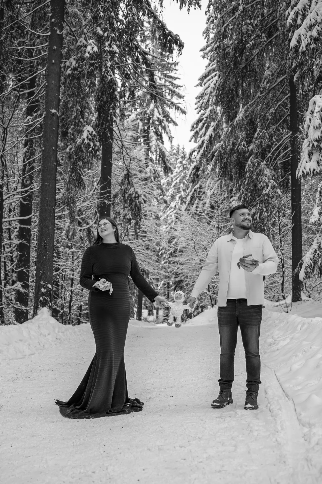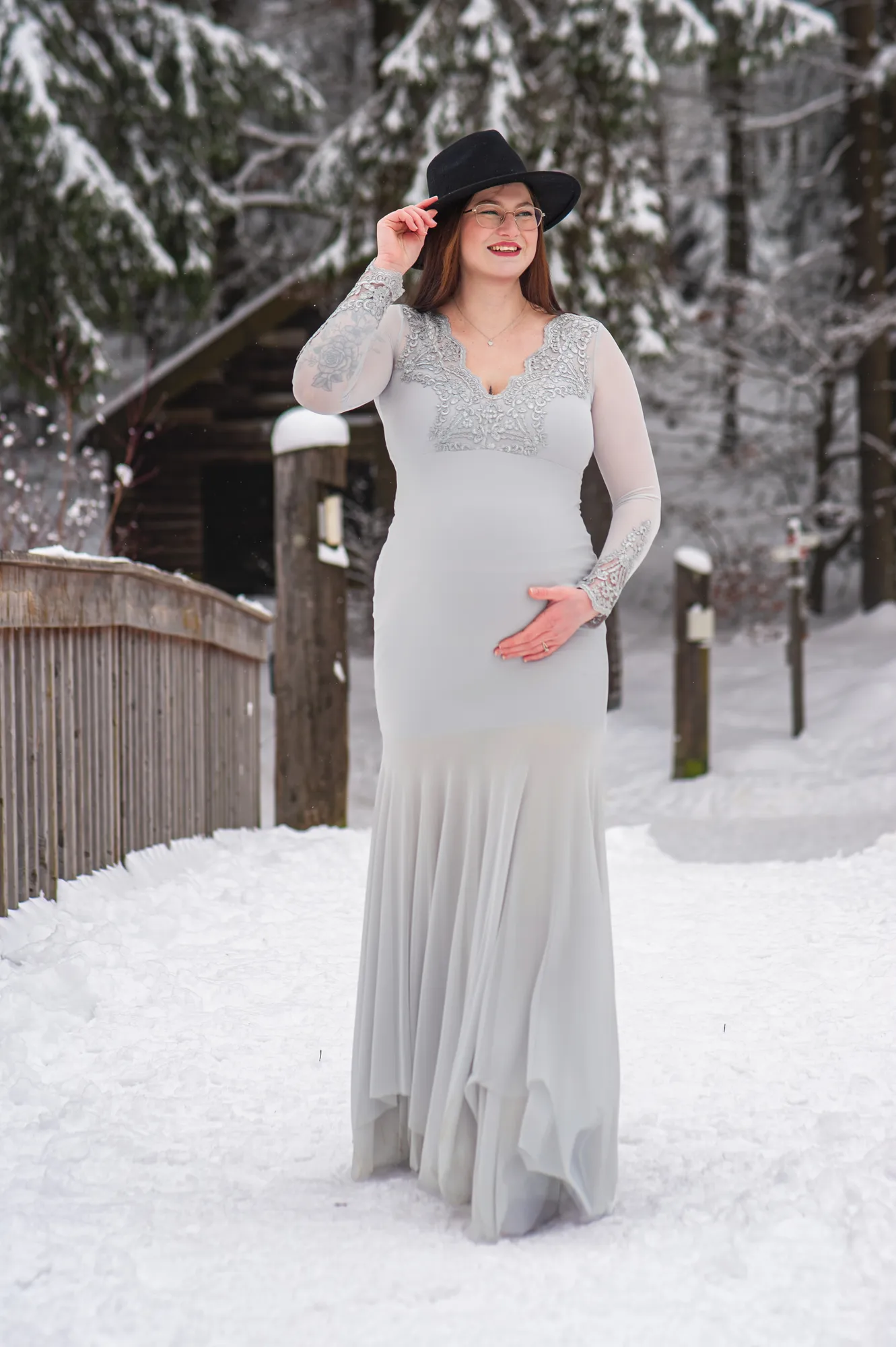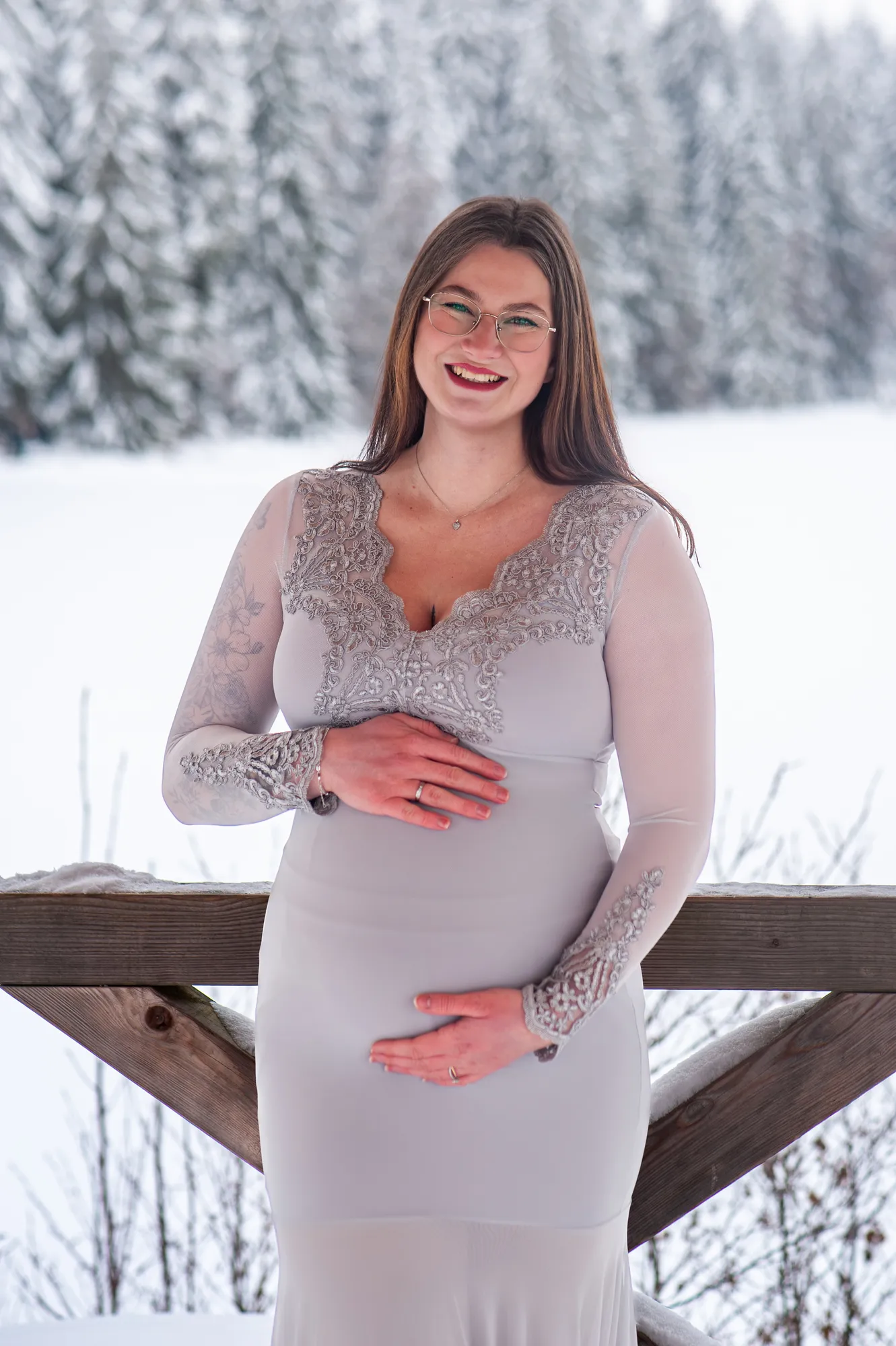 Später wechseln wir zu eleganten Shootingkleidern. Fließende Stoffe bewegen sich im Winterwind, der Babybauch wird sanft umspielt und die Szene bekommt eine fast märchenhafte Leichtigkeit. Der Kontrast zwischen Winterlandschaft und den eleganten Kleidern verleiht den Bildern eine besondere Tiefe.