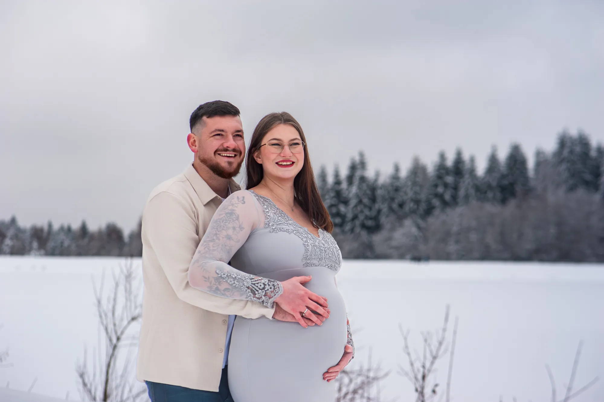 Verträumtes Babybauchshooting am Fichtelsee im Winter. Schnee, Vorfreude und liebevolle Momente eines Paares, das sein erstes Kind erwartet.